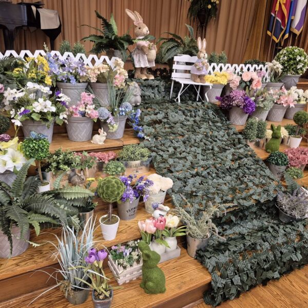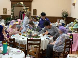 The festivities continued with door prizes, engaging games, and beautifully decorated tables adorned with bunnies and floral arrangements, all thoughtfully tied to the Easter Parade theme. Guests were treated to a lovely luncheon featuring quiche, green salad, deviled eggs, and coconut cake—perfectly complementing the spring celebration.