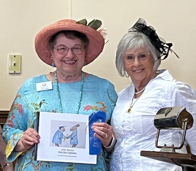 Congratulations to Susie Kelley and Pamela Schwartz for two first place entries each in crafts and photography. Susie entered a beautiful watercolor painting (from her time in our watercolor class) of her cat and a book for children she wrote and illustrated. Pamela entered the photography contest, and these two entries will be entered in the National GFWC Photography Contest. Good Luck to Pamela!